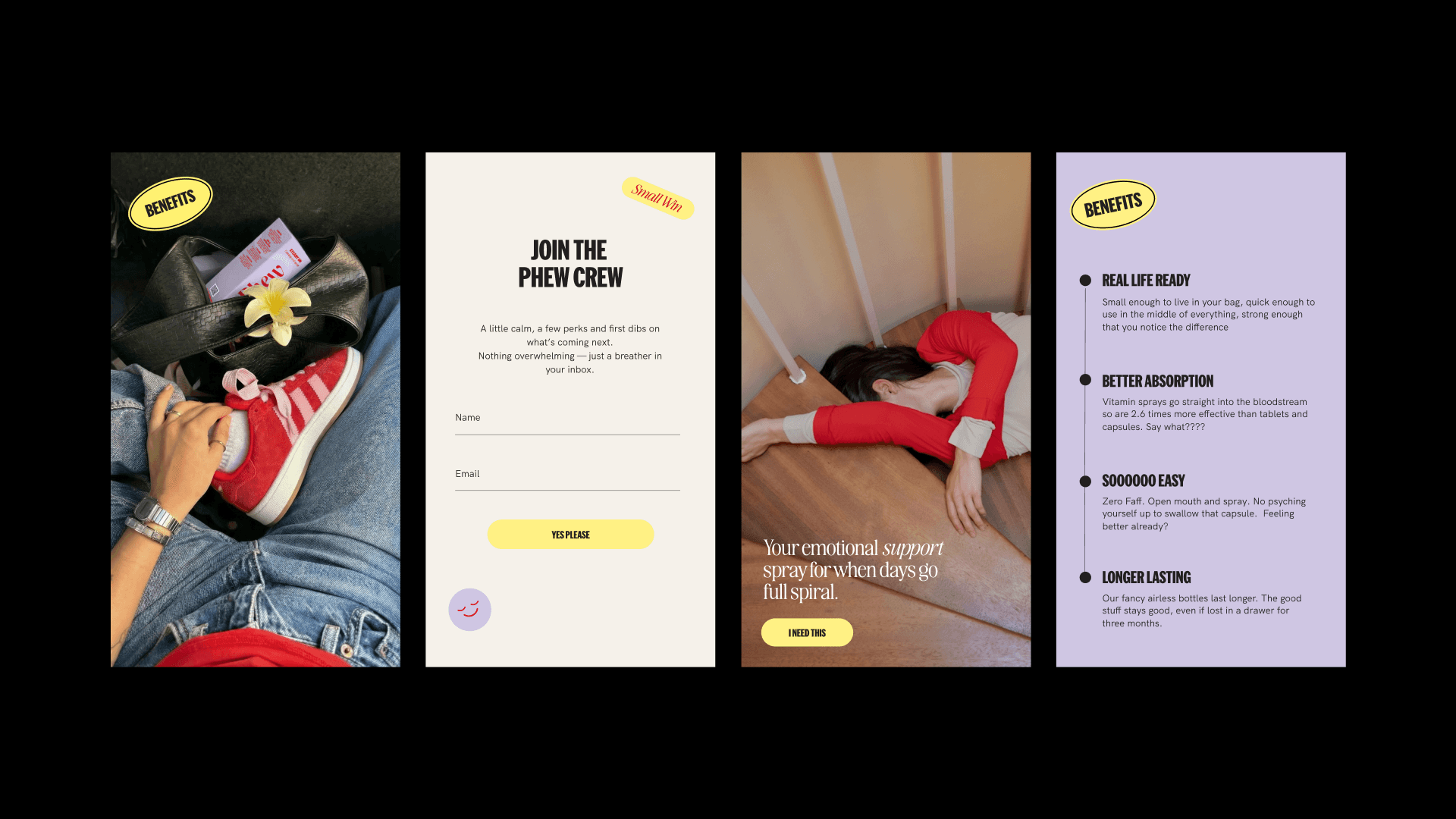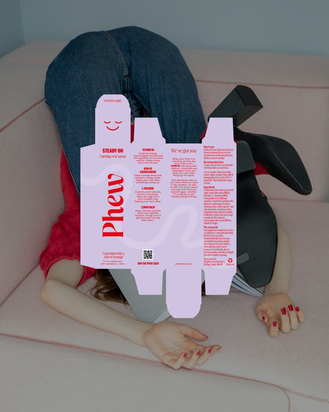 From the outset, the opportunity was clear. The supplement space is crowded, with brands that often feel clinical, overly polished or disconnected from how people actually live. A lot of time was spent understanding what already existed, and much of it looked and felt the same. That became the starting point. Rather than following those conventions, the focus shifted to positioning Phew as something more human, grounded and relevant. The spray format played a key role in this, offering a quick, practical alternative that removes friction rather than adding to it.
