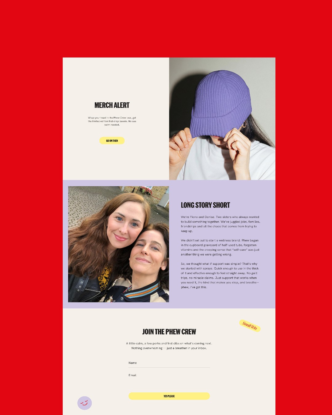 Phew started with a clear idea. A modern oral spray brand designed to support stress, sleep, energy and immunity in a way that actually fits into real life. Created by two sisters who wanted to build something together, the intention was never to add another overwhelming wellness routine, but to offer something simpler and more considered.